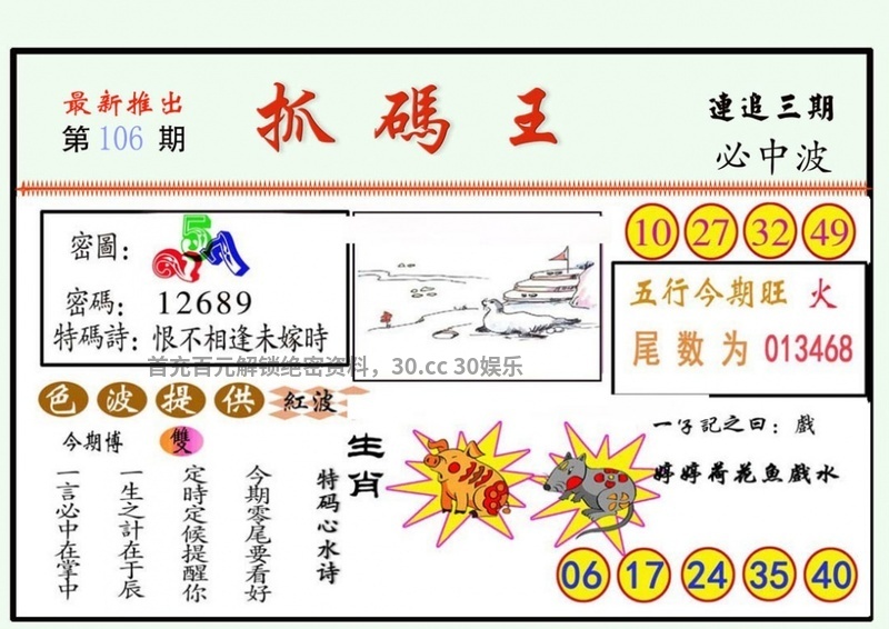 106期:男女两肖【女肖+龙虎】开:猪43准